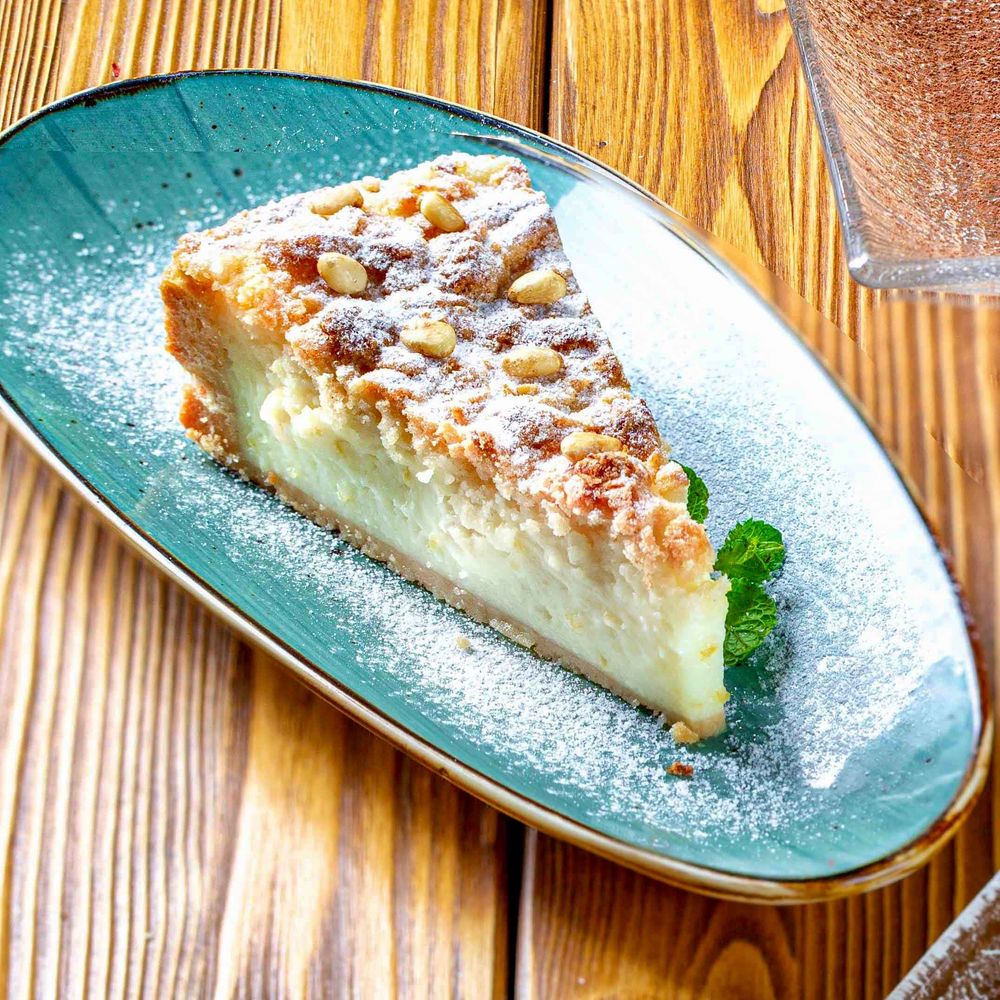 Освежающий грузинский десерт. Тающее во рту лимонное суфле с ноткой ванили, украшенное сахарной пудрой и золотистым кедровым орехом. 195гр.